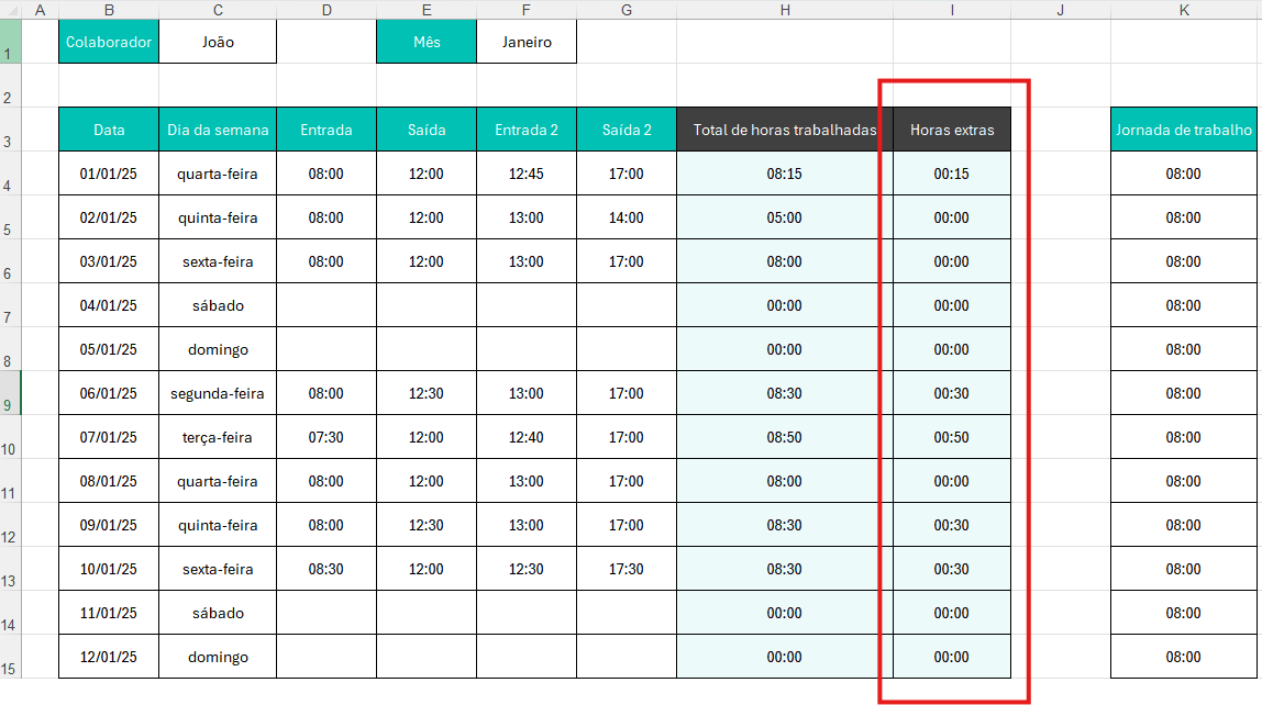 Geralmente adicionamos colunas para: data, dia da semana, horários de chegada e saída, pausa para o almoço, total de horas trabalhadas e horas extras.